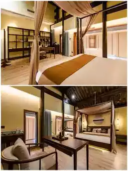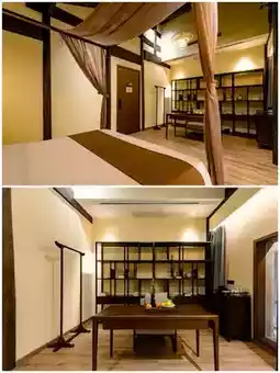 The rooms blend warmth and sophistication. Four-poster carved beds paired with soft, skin-friendly bedding create a cozy and restful sleep space. Antique desks and display shelves adorned with delicate tea sets and small ornaments allow guests to immerse themselves in Chinese elegance during their stay. Some rooms feature large floor-to-ceiling windows or skylights, offering breathtaking views of the mountains and forests, and the chance to sleep under a starry sky, embracing the beauty of nature.