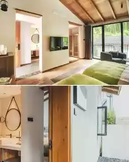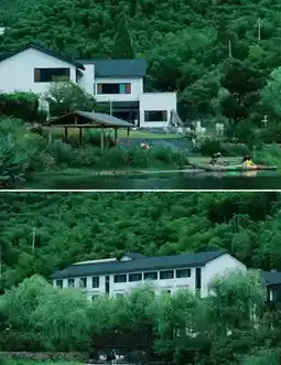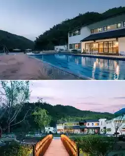 The homestay boasts exclusive access to 60 acres of lawns, lakes, and an entire bamboo-covered mountain. Pure white minimalist villas wind along the lake, with gray stone walls, wood finishes, and iron staircases interwoven to create a wabi-sabi aesthetic. The 3-story public area features connected corridors and bridges, with floor-to-ceiling windows framing the bamboo sea and clouds as flowing light and shadow. An infinity pool is nestled in the embrace of the surrounding mountains—a perfect photo spot featured in variety shows!