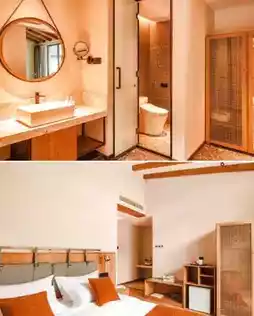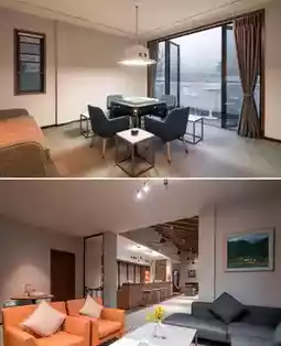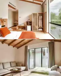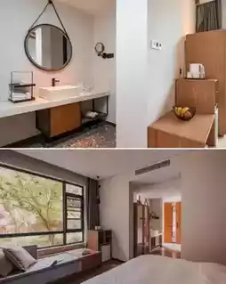 Tingjian offers 50 meticulously designed rooms built into the mountains, each with panoramic floor-to-ceiling windows showcasing mountain and lake views. Smart lighting and curtains, paired with high-quality bedding and imported bathroom fixtures, create a blend of technology and comfort. The plant-based toiletries are extracted from the homestay's own farm. Each villa includes a shared living room, ideal for private and cozy gatherings with friends or family.