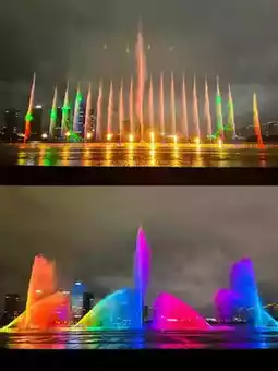 Surprisingly, the back of the hotel leads to Tianming Lake Park. We went out for a walk in the drizzle and happened to encounter the fountain light show held to welcome the marathon. It started on time at 19:00, with a grand scale and fire-breathing performances, accompanied by the exciting Ekaterina background music, which was wonderful. When the marathon started the next day, the view of the fountain from the east area room was excellent.