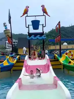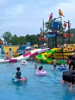 Beyond the Nine-Turn Bridge lies the joyous Pirate Ship Water Fortress—a paradise for kids. A giant bucket tips over, drenching everyone in a splash of cool water. Children dart between water slides and the pirate ship, armed with water guns, their laughter and shouts filling the air.