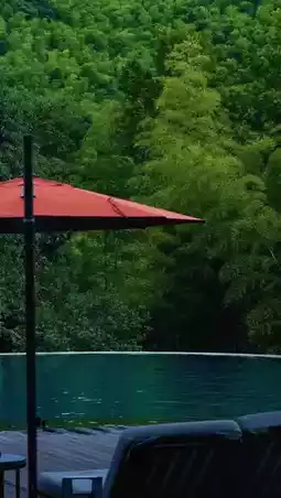 An infinity pool embraced by the entire forest, resembling a Tiffany blue gem nestled in green silk