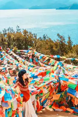 Liyuan cliff, hung with fluttering prayer flags, said to be the source of Ligu Lake, colorful prayer flags make the lake water more green
