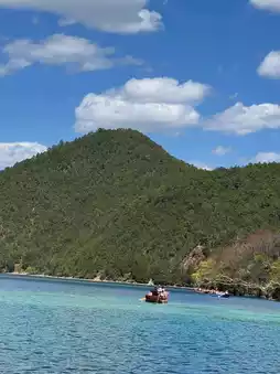 Lugu Lake is located on the border of Yunnan and Sichuan provinces, in the remote mountains of southwest China. It sits at an altitude of 2,685 meters (8,809 feet) and is surrounded by forested hills, green meadows, and distant snowy peaks.