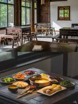 4⃣Dining: Complimentary breakfast features wild, locally sourced ingredients in southern Shaanxi flavors. Guests can also enjoy tea and koi fish viewing in the teahouse.