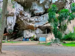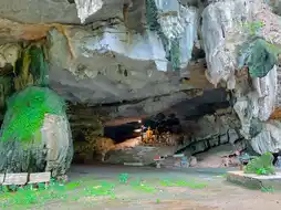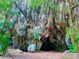 This limestone cave features stalactites and stalagmites, offering a shady atmosphere.