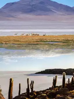 Besides the salt flat, there are many other unique natural landscapes around Uyuni. Volcanoes, geysers, hot springs, and colorful lakes complement each other. The Tunupa Volcano stands tall on the earth, with hot steam rising from its crater, as if it were the earth's breath. Geysers erupt regularly, sending huge columns of water into the sky with a deafening roar, showcasing the immense power of nature. Hot springs are the perfect place for weary travelers to relax, soaking in the warm water and admiring the surrounding scenery, washing away all fatigue. The colorful lakes, such as Laguna Colorada and Laguna Verde, are masterpieces of nature. Laguna Colorada gets its vibrant red color from the algae and microorganisms in the water, and the lake is also home to many flamingos, whose figures contrast with the red water, creating a picturesque scene.