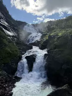 The highlight was definitely the Flam Railway ๐, one of the steepest train journeys in the world! It winds through tunnels and alongside roaring waterfalls ๐. A special stop at Kjosfossen waterfall treated us to a magical sight: a red-dressed โdancing ladyโ ๐โจ, a mythical Huldra from Norwegian folklore, appearing in the mist.