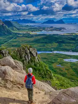 Round trip, about 5.6 km, took us about 3 hours. We also saw locals running up and down the mountain with their children or walking their dogs. It's a popular route (but be sure to wear the right shoes and equipment). The view from the summit is fantastic, offering 360-degree views. 📍Stop at Rorvukstranda Beach for lunch.