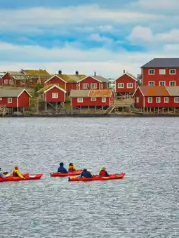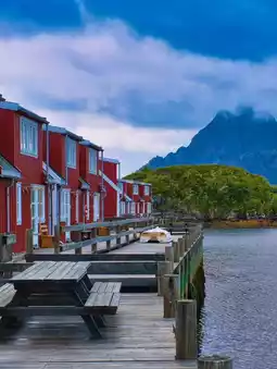 📍Arrive in the evening at Nyvagar Rorbuhotel, a row of converted red fishermen's cottages with a full restaurant. You can book a great sauna and outdoor bathtub with mountain views.