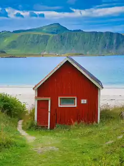📍Check out and drive to Ramberg Beach, known as the "white sand paradise above the Arctic Circle." The approximately one-kilometer-long beach features soft white sand and clear waters, framed by majestic mountains in the background, creating a picturesque natural landscape. The famous red huts set against the backdrop of the beach.