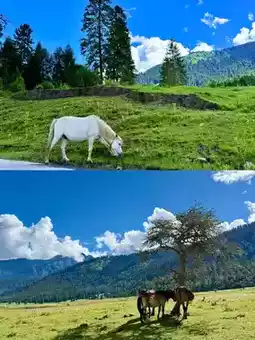 3️⃣ Alpine Pasture: Horse riding experience (50 RMB/hour), with snow mountains and wildflowers as the backdrop