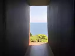The glass-walled building, which also serves as a rest area, offers a stunning view from the outside and a relaxing space inside. You can walk through a long, dark corridor that opens up to the sea, and from the entrance, you'll encounter many beautiful architectural structures.
