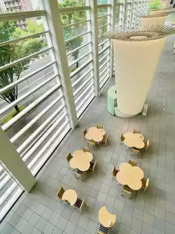 Inside, the spacious two-story atrium welcomes visitors with natural light — a public area freely accessible without an admission fee. The 1st floor museum shop features beautifully curated art goods and local crafts, while the 2nd floor café offers a relaxing place to take a break surrounded by creative energy.