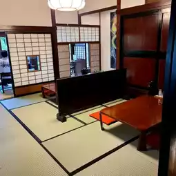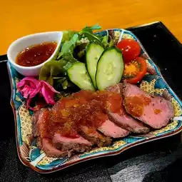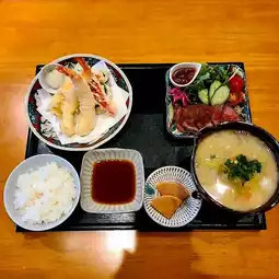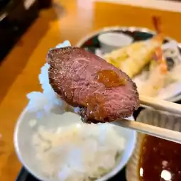 Amamichaya, a renovated traditional house near Yufuin Station, is a popular lunch spot where you can experience Oita's home-style cooking. The roast beef and tempura set I ordered this time was particularly impressive. The roast beef was thinly sliced, tender, and juicy. The special soy sauce and savory wasabi added to create a clean yet rich flavor. The tempura, with its shrimp and vegetables, was crispy and light, without being greasy. The accompanying dangojiru (steamed rice cake soup) was a heartwarming experience, with a miso-based base, chewy flour dumplings, and vegetables. The restaurant boasts a homey, elegant atmosphere, allowing you to enjoy a leisurely lunch while immersing yourself in a Japanese atmosphere.