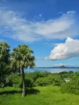 🌴 Palm trees and lush greenery create a tropical paradise-like atmosphere.