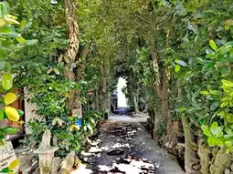 The trail is lined with tall Fukugi trees, which are lush and green. The branches and leaves are interwoven into a natural green tunnel. Walking in it is like being in a fairy tale world.