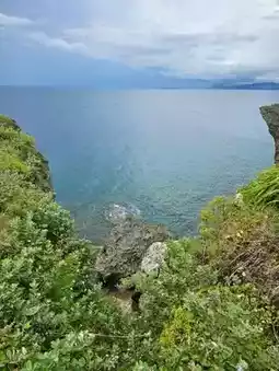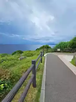 The East China Sea's azure waters and white waves spread out below. On clear days, you can enjoy the stunning blue hues, and at dusk, the sunset is breathtaking.