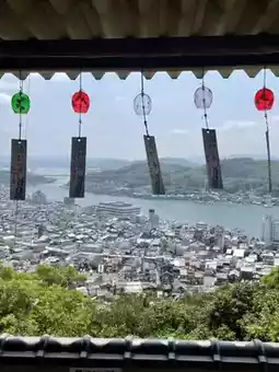 As you descend, you'll arrive at Senkoji Temple, where you can hear the sound of wind chimes from afar. With the sea breeze and the chime sounds, it feels refreshingly cool. The entire temple is built on the mountainside, blending with the natural rocks at varying heights. One of Senkoji's famous sights is the bell tower "Kyo-on-ro" (Echo Tower), which has been selected by Japan's Ministry of the Environment as one of the "100 Soundscapes of Japan." However, you can't hear the bell being rung on-site, nor can you ring it yourself. The view from here is excellent, offering a bird's-eye view of the Onomichi Waterway and the distant Onomichi Bridge.