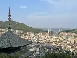 As you ascend, the rooftops of ancient temples come into view. Senkoji Temple quietly watches over the mountain town, its wooden tiled roof nestled between lush greenery and the blue sky, blending harmoniously with the port town scenery. In the distance, the Onomichi waterway stretches out, with a white bridge connecting both shores and boats leisurely passing by, creating a quintessential Seto Inland Sea landscape.
