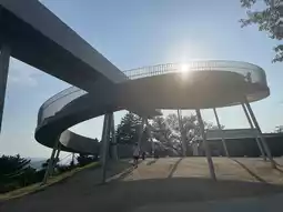 Continuing to the summit, you’ll encounter a modern spiral observation deck. The sunset perfectly aligns with the circular railing, its rays piercing through the steel frame and illuminating the entire plaza. From this vantage point, you can gaze upon the entirety of Onomichi: rooftops, waterways, islands, and bridges, piecing together a stunning mosaic of light and shadow.