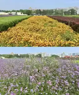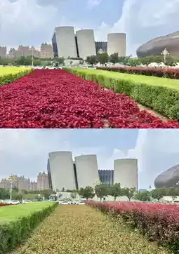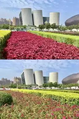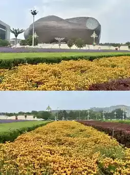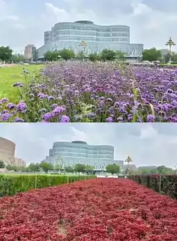 In the middle of these four buildings is a particularly beautiful large flower square, where various flowers of different colors and varieties are planted in radiating bands spreading out from the center, creating a spectacular view.