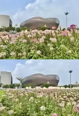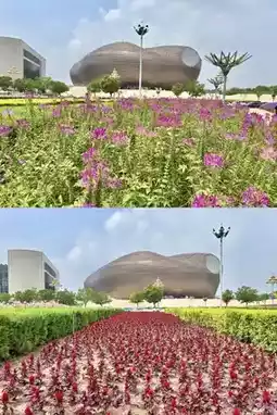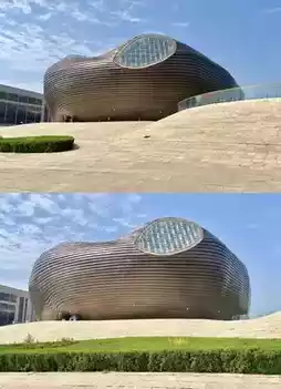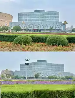 Right next to it is the Ordos Library, shaped like three vertically standing books. Opposite it, resembling two large round cakes, is the Ordos Grand Theatre. Next to it, with a fresh and elegant color, is the Art Center, all featuring distinctive designs.