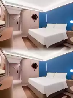 The rooms are equipped with smart and comprehensive facilities, all featuring an intelligent guest control system. The bedding uses bare-sleep level Serta champagne gold satin four-piece sets, with natural basil citrus essential oil crystal stones placed by the bedside for a soothing scent. Rooms are equipped with Bluetooth speakers and cinema-grade blackout curtains to create a deep sleep environment. Additionally, rooms include refrigerators stocked with various beverages, bathrooms with dry and wet separation, some room types with smart toilets, and hairdryers from the Laifen brand, showcasing quality in every detail.