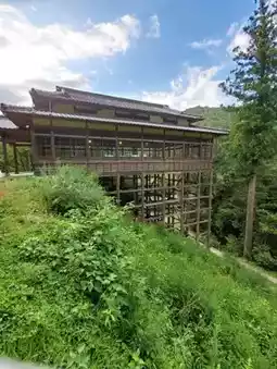 The Sanroden is a kakezukuri structure with about 90% of its floor area protruding from the mountain cliff on the northern slope along the approach,