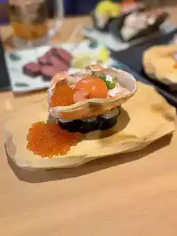 Salmon and seafood packed tightly in the shell! The flavor of red vinegar enhances the seaweed rolls, blending perfectly to create a luxurious taste. Truly a delicious battle, this dish overflows with satisfaction.