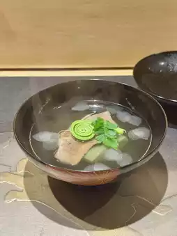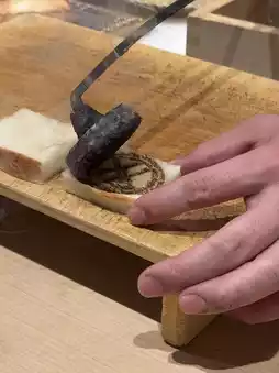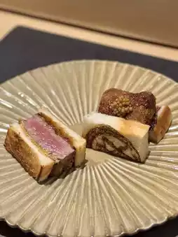 Vacuum-cooked Wagyu, needlefish sushi, broad beans, sea bream roe, baby scallops, lily bulb petals, thick omelet, Numata-style.