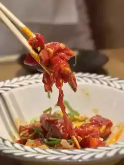 The chewy noodles mixed with egg and sweet-spicy sauce create a mellow and rich flavor.