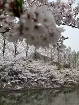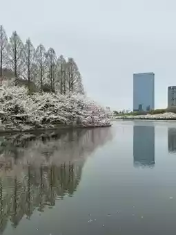 Strolling along the lakeside, the clear water ripples softly in the breeze, mirroring the cherry blossoms like a dreamlike fairyland. Visitors pause by the lake, enjoying the tranquility and beauty, with birdsong and the rustling of petals whispering the melody of spring.