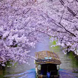 Drift along the cherry blossom river by boat, with weeping cherry trees brushing the water on both sides. Ride the cherry blossom boat and feel the shower of flower rain stirred up by the boatman’s pole🌸