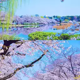 Get off at Daigo Station and walk about 10 minutes to the temple entrance. Weeping cherry trees cascade like a waterfall in front of the five-story pagoda. At dusk, lanterns light up, and the cherry blossoms reflect with the gold leaf of the Buddhist hall.