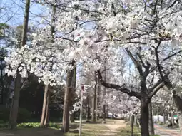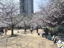 The pale pink cherry blossoms are fleeting and cute. People were already spreading out sheets for hanami, drawing pictures, and playing with balls and other items, creating a lively atmosphere.