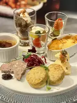 A visually and tastefully delightful dish. Delicate appetizers, exquisite savory items, and elegant sweets harmonize perfectly, making it a luxurious high tea that pairs wonderfully with tea or alcohol.