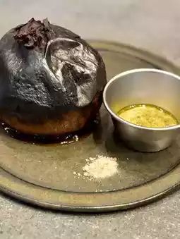 The Awaji onion stone oven roast is crispy on the outside, tender, sweet, and juicy on the inside. The high-temperature cooking locks in the umami, making it a simple yet outstanding dish that highlights the charm of the ingredients.