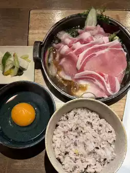 Review of a shabu-shabu and sukiyaki restaurant. If you're visiting Osaka and looking for a delicious yet affordable place to eat, I highly recommend this restaurant, Shabuwara. The restaurant offers menus in Thai, making it very convenient. Their main focus is on beef dishes, but for those who don't eat beef, like me, they also have pork options. The quality of the pork is excellent. I ordered the sukiyaki set with dark broth, which includes meat, vegetables, tofu, rice, and the sukiyaki dark broth that has a sweet and salty flavor—not overly sweet, but perfectly balanced. The pork is incredibly tender and pairs wonderfully with the rice. If you visit during lunchtime, rice refills are free!