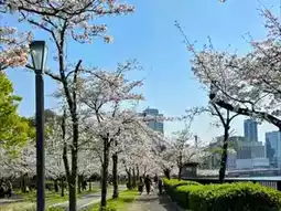 Sakuranomiya Park consists of Nantenma Park, Kema Park, and Buson Park, collectively known as Kema Sakuranomiya Park, stretching 4.2 kilometers. Every spring, over 4,000 cherry trees bloom in the park, creating a spectacular pink scene along both sides of the river. You can walk all the way to Tenmabashi and the Mint Bureau, where the cherry blossoms are beautifully in full bloom.