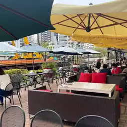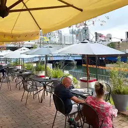 You can choose to sit outdoors or indoors; we sat indoors. If the weather is nice, sitting outside by the river is great, and the tables look beautiful and are perfect for photos. The indoor tables have a yellow tint and are not suitable for photos...
