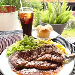 Sirloin steak lunch. The portion is large and comes with vegetables. The cake is soft and fluffy, and the cream on top is super, super delicious.