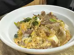 A Japanese rice bowl with chicken and egg mixed together, with a slightly sweet taste. The base flavor is a bit salty.