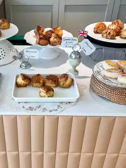Delicious-looking baked goods like scones and madeleines are lined up on the counter, so cute!