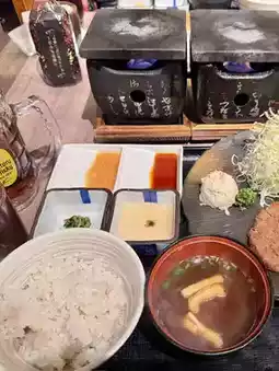 🌟 Each person gets a small stove, so you can cook the meat to your liking. With three dipping sauces—grated yam, sweet mustard sauce, and soy mustard—and a side dish like pickled vegetables to mix with the rice, the Japanese white rice is unbeatable, as everyone knows. The fried beef cutlet is truly delicious 💕 Ending with warabi mochi as dessert is also fantastic!