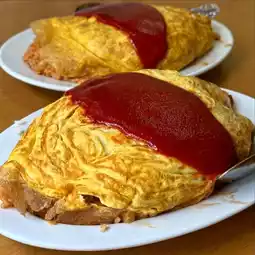 - Giant Omurice (750 yen): Rice stir-fried over high heat in a Chinese iron pan, each grain distinct and packed with chicken pieces. Wrapped in a wafer-thin egg crepe and topped with tomato sauce erupting like a volcano, it’s a feast for both the eyes and taste buds.