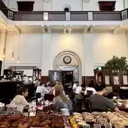 Recommend arriving early to secure a spot! I waited 10 minutes after arriving around 8 AM. The serving speed is a bit slow but totally worth it. I ordered the signature croissant set; the outer layer is so crispy it flakes off, paired with rich coffee. Sitting by the old bank counter for breakfast adds a full sense of ceremony 💫 The price is higher than an ordinary café, but dining while admiring the vintage architecture instantly boosts the value!