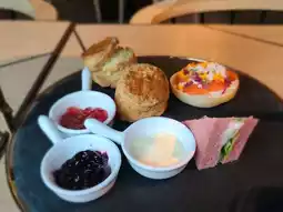 The two-tier tray includes six types of sweets on the upper tier and three types of savory items, including scones, on the lower tier. A welcome drink with one alcoholic beverage is included, and drinks are unlimited. I enjoyed a glass of draft beer, iced coffee, and tea in sequence.