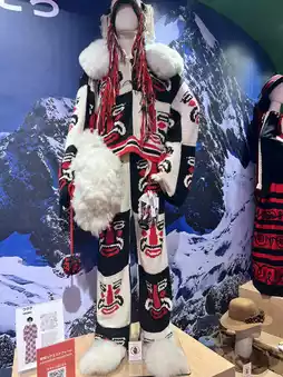 The final exhibition area showcases traditional woven clothing, including a striking outfit woven with red, black, and white mask patterns, perfect for a photo op against the snowy mountain backdrop!📸