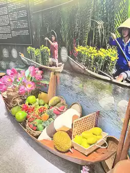 🔸 Floating Market Scene Recreation — Boat models loaded with tropical fruits and flowers make you feel like you're on the Mekong River, full of rich Vietnamese atmosphere.
